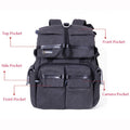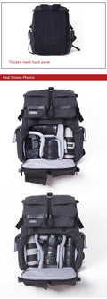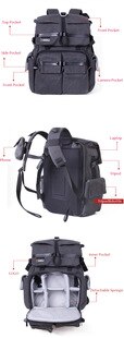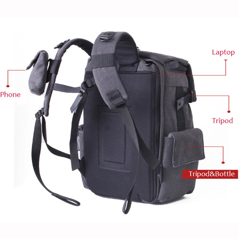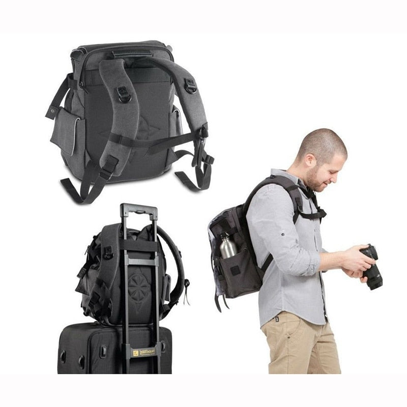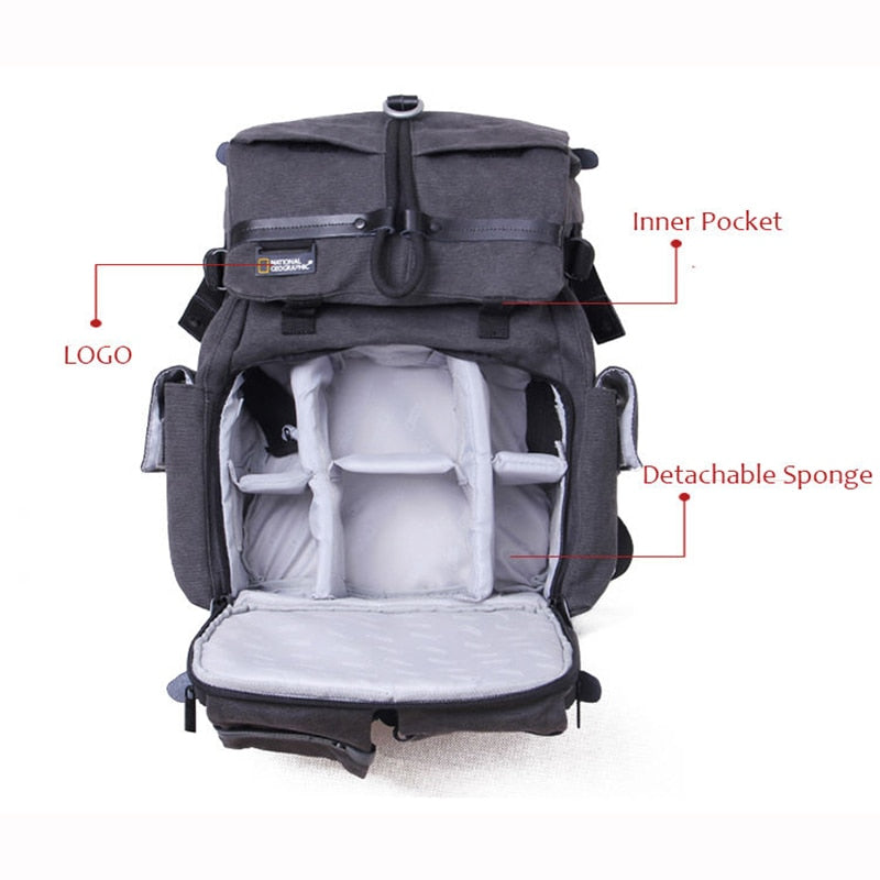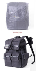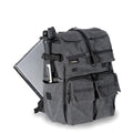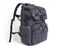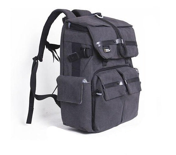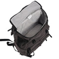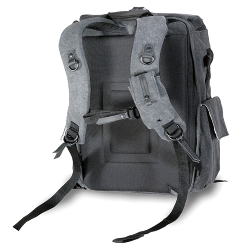 The Large Grey Explorer Photographer Backpack is a waterproof canvas backpack with interior padding designed to carry photo or video gear or personal items and a laptop computer with a screen up to 15.4". It has a dividable lower padded compartment for a camera or camcorder and accessories. There is a rear padded zippered compartment that can hold a laptop computer and accessories and an upper personal storage compartment. The division between the top and lower compartments can be removed to create one large storage space.
