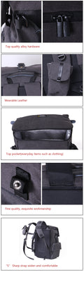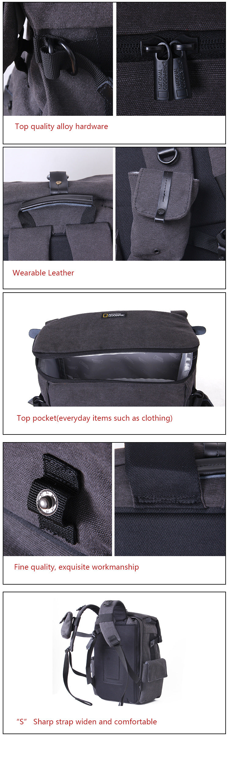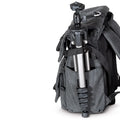 The Walkabout has 2 side pouches for water bottle or accessories, a front organizer pocket with four sleeves for cell phone, batteries, and other accessories. There is a detachable, protective pouch for cell phone or MP3 player that can be used on a belt or on a bag. The bag has straps that allow a tripod or personal items to be tied to the bottom of the bag. There is a foldable rain cover that protects the bag and contents from the elements. The rucksack is carried by a leather trimmed handle or a backpack harness.
