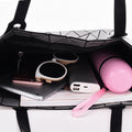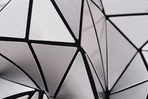 Our Women's Prism Geometric Casual Tote Hand Bag features small triangles placed on lined mesh fabric. The interior zipper pocket is large enough to hold a large wallet and other valuables. When carried, the bag takes on a unique shape, but when not in use, can be laid flat for safe storage. The handle is adjustable and can be used as an over the shoulder bag.