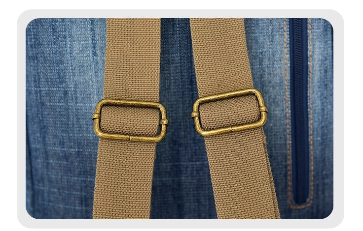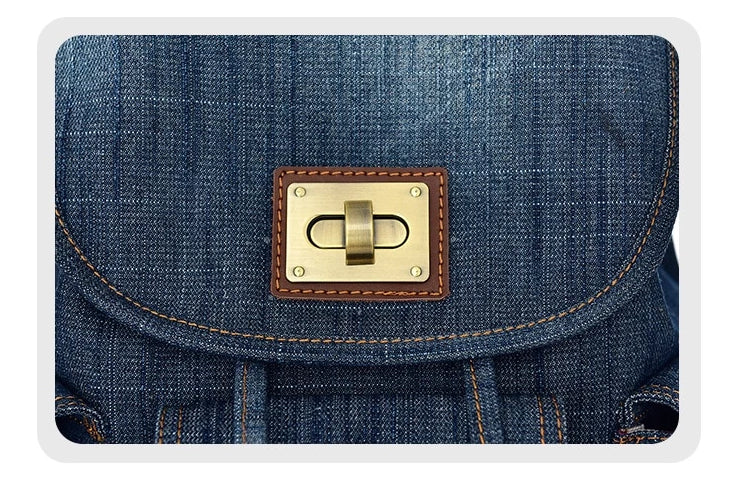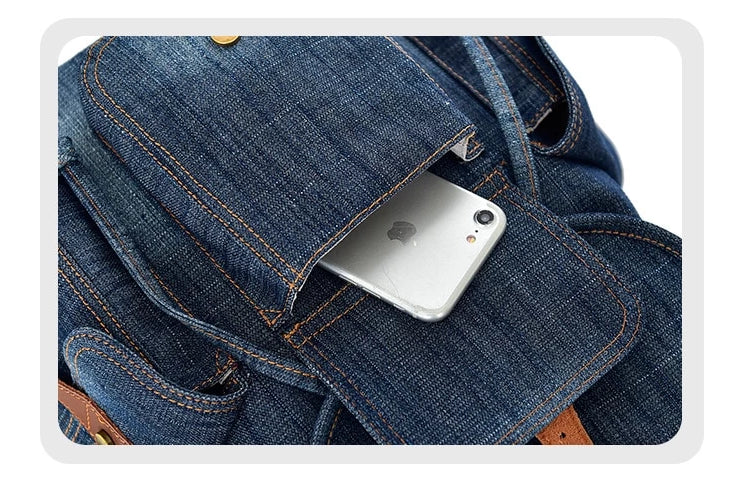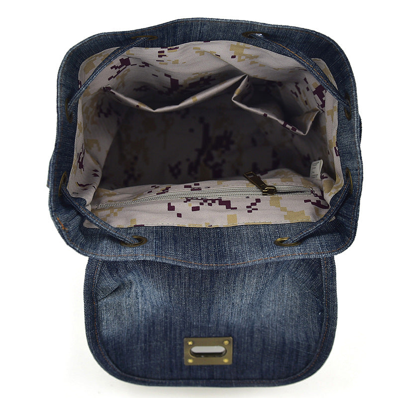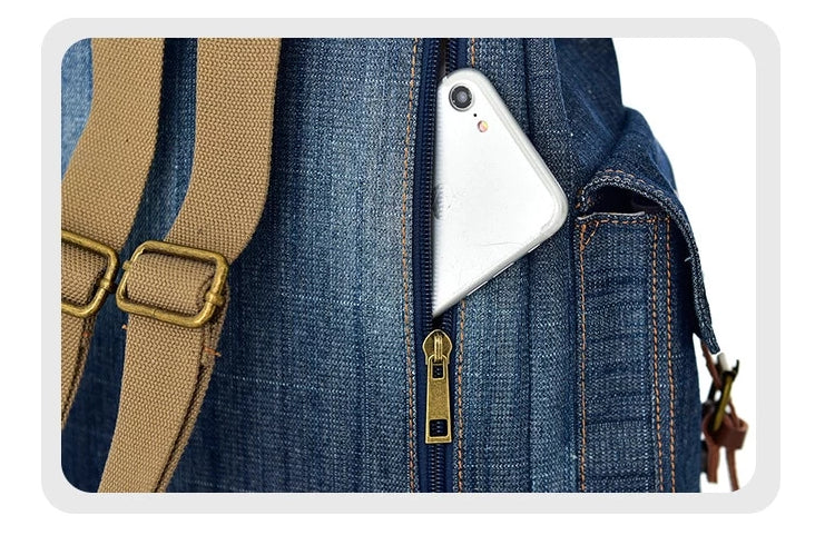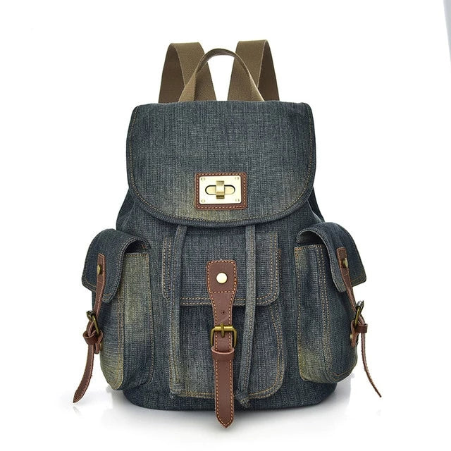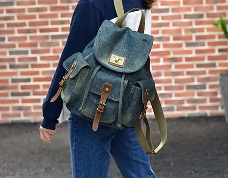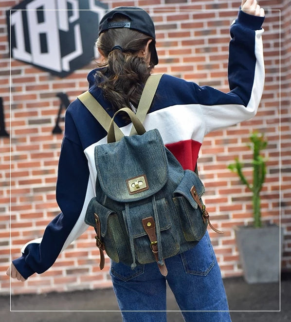Take your style on the go with this faded denim backpack, featuring an allover logo design, front logo detail and brass hardware. Top zipper closure, front zipped pocket and interior pockets. Canvas straps, vegan leather buckles and an anti-theft security pocket completes the backpack. Handy pockets adorn the outside of the bag.