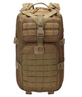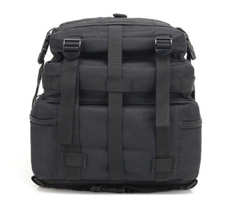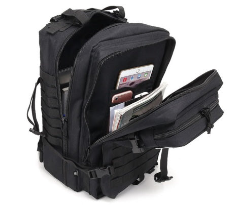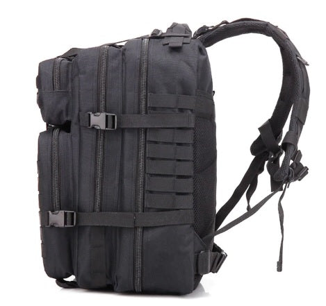 This 50L Large Military MOLLE Tactical Army Backpack features dual hidden side compartments, that is ideal for storing compact gear such as a pocket knife, multi tool and important documents. The padded back and contoured yoke style shoulder straps evenly distribute the weight of the pack. The fully adjustable and removable sternum and waist straps provided added stabilization and weight distribution pack for all day comfort. In addition, the tactical pack features dual sided cinch straps, top carry handle, and double zippers.