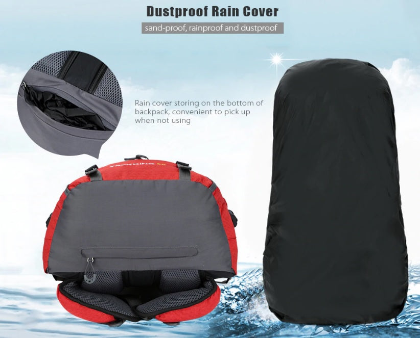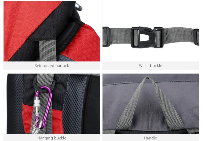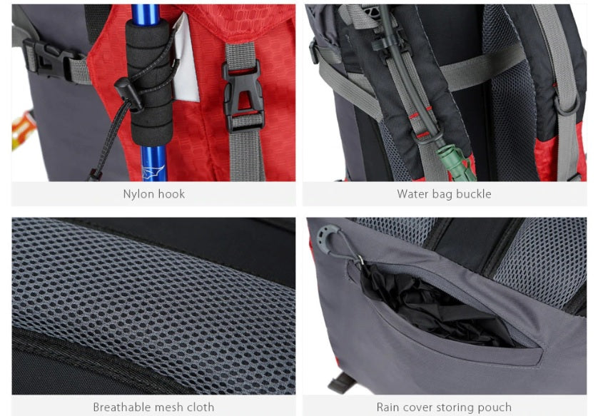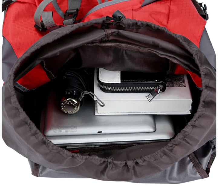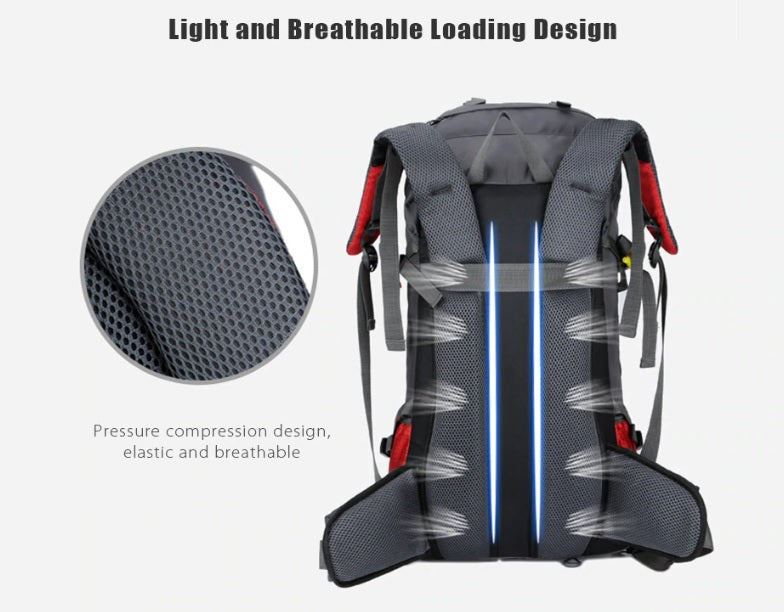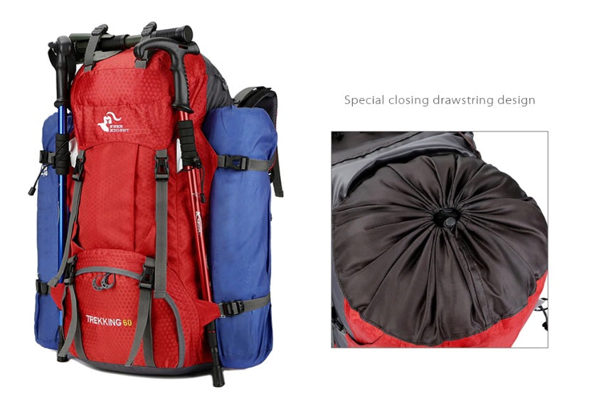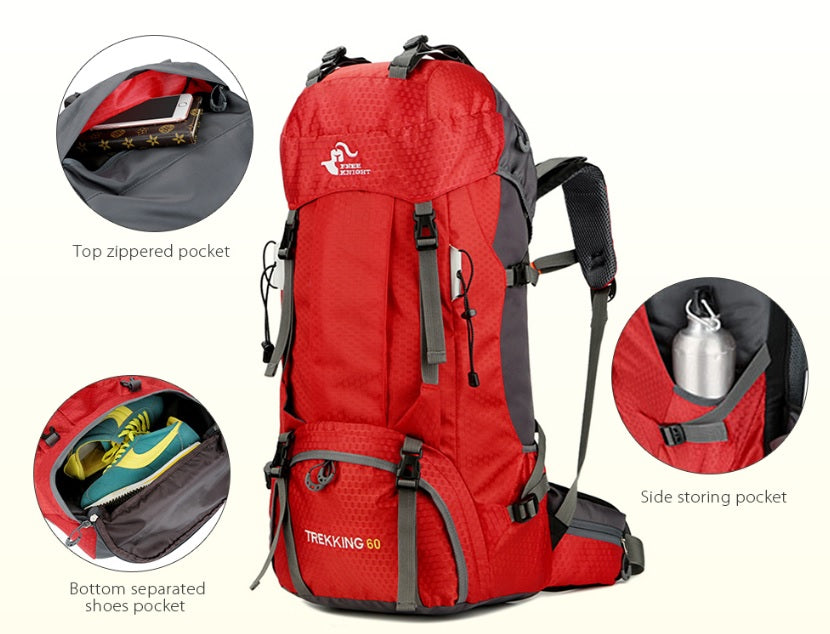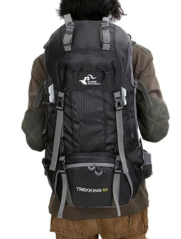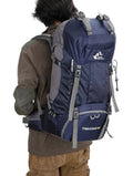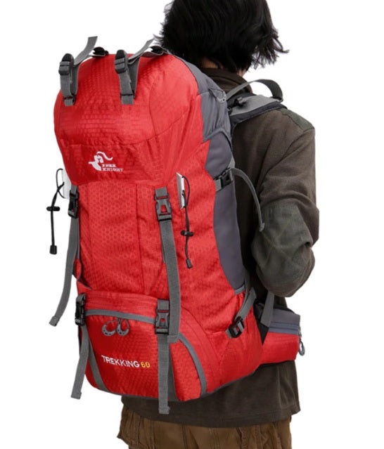Embark on an unforgettable adventure and keep your gear handy in our 60L High Capacity Camping Hiking Backpack. Mesh on the shoulders and adjustable waist keeps you dry while traversing through parks and forests. An adjustable shoulder harness with high-density foam padding ensures a comfortable fit. The sternum strap on the front stabilizes your pack, while additional zippered pockets on each side adds storage space. 60L High Capacity Camping Hiking Backpack with adjustable load-lifters feature mesh and high density foam padding. Adjustable sternum strap stabilizes pack for maximum comfort on the move. Molded foam back panel with channels keep your back dry. Drop bottom sleeping bag compartment with divider. Waist belt with mesh and high-density padding wicks moisture away. Top-load main compartment with gusseted drawstring closure and adjustable top lid. Front access to the main compartment ensures easy access. Roomy dual zippered pockets on each side. Hinged front pocket with zipper holds extra gear. Compression straps on bottom and sides keep the load closer to the frame.