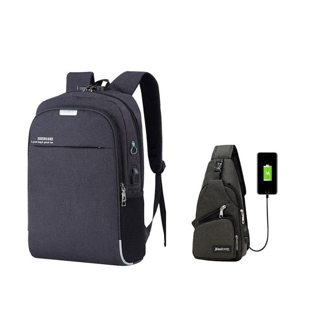 This Anti-Theft Laptop Backpack w/ USB Charging Port and Small Sling Bag Set keeps your valuables safe when you're on the go. Our backpack with lock and charger is made from durable, water-repellent fabric and features anti-theft construction with a cut-proof frame. This backpack with charger and lock is detailed with an integrated USB charging port, interior straps and pocket to secure all sorts of small items, and protective pockets for your laptop and tablet. Available in black, blue, wine red and grey, this backpack includes a top grab handle and adjustable backpack strap that makes it comfortable to carry for all day use. A built in locking system locks all your valuables inside. This Anti-theft backpack with lock and charger is waterproof, comfortable and environmentally made. Additional features include a media port for easy access to your headphones.