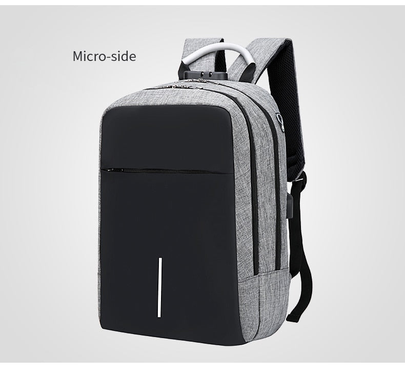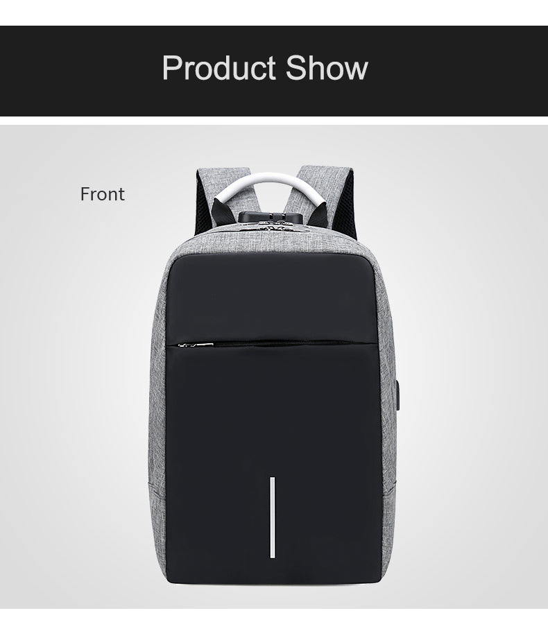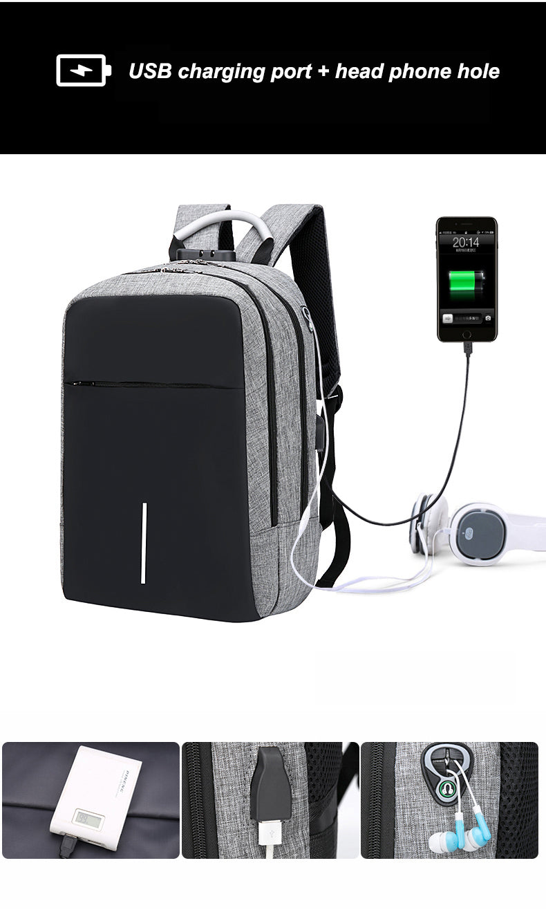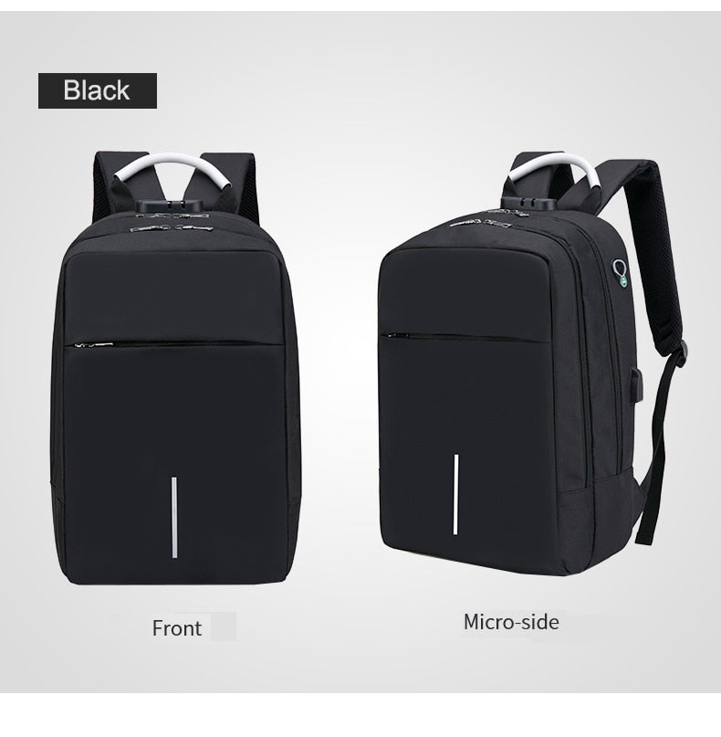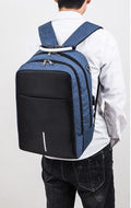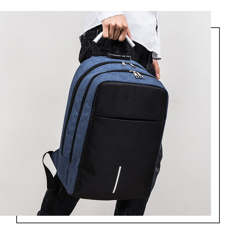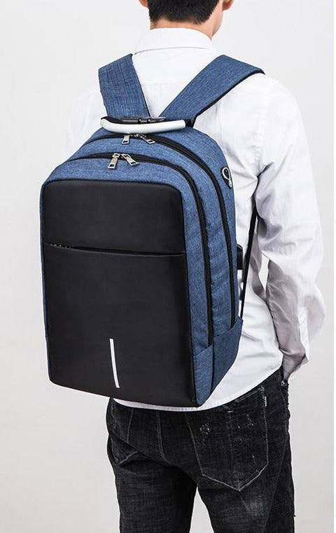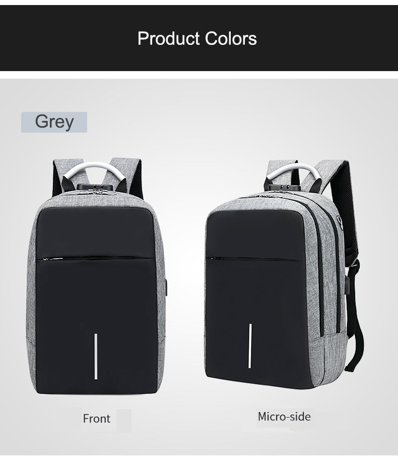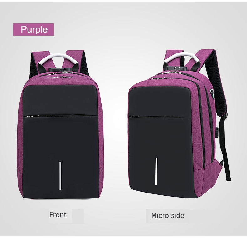 This Medium Oxford Anti-Theft 15" Laptop Backpack With USB Charging and TSA Lock keeps your valuables safe when you're on the go. Our backpack with lock and charger is made from durable, water-repellent fabric and features anti-theft construction with a cut-proof frame. This backpack with charger and lock is detailed with an integrated USB charging port, interior straps and pocket to secure all sorts of small items. Two large protective pockets for your laptop and tablet. Available in blue, black, purple and grey, this backpack includes a top grab handle and adjustable backpack strap that makes it comfortable to carry for all day use. A built in locking system locks all your valuables inside. This Anti-theft backpack with lock and charger is waterproof, comfortable and environmentally made. Additional features include a media port for easy access to your headphones.