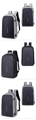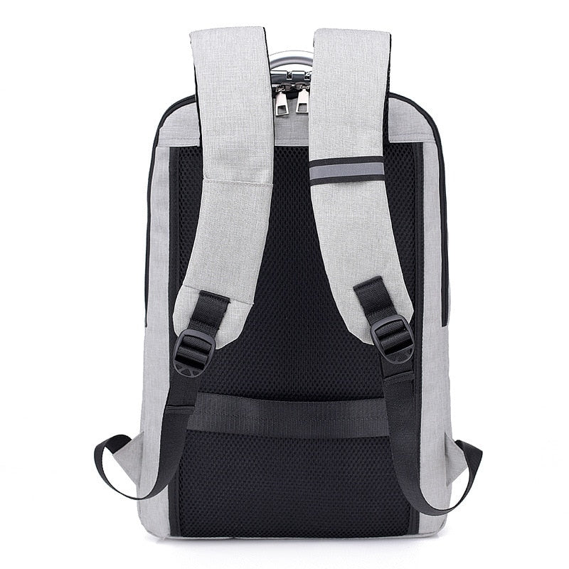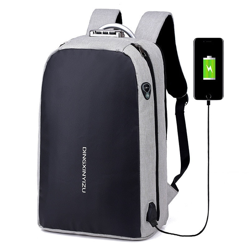This Men's Anti-Theft Backpack with USB Charging and Lock keeps your valuables safe when you're on the go. Our backpack with lock and charger is made from durable, water-repellent fabric and features anti-theft construction with a cut-proof frame. This men's large backpack with charger and lock is detailed with an integrated USB charging port, interior straps and pocket to secure all sorts of small items, and protective pockets for your laptop and tablet. Available in black, dark-grey and light-grey, this backpack includes a top grab handle and adjustable backpack strap that makes it comfortable to carry for all day use. A built in locking system locks all your valuables inside. This Men's Anti-Theft Laptop Backpack with USB Charging and Lock is waterproof, comfortable and environmentally made. Ideal for a 15.6 inch laptop. The perfect companion for school, work or any day trip.