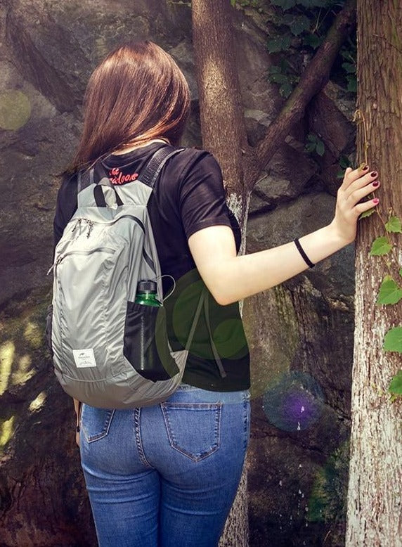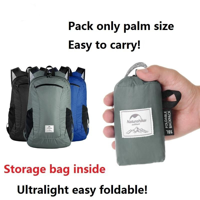 Carry your everyday or adventure essentials in hands-free comfort and style in this Naturehike Foldable Light Backpack. This compact, lightweight, and durable nylon backpack features contrast trim, bright logo accents, and an external compression for superior load management; and it's available in several colors. It boasts a spacious, zippered main compartment with plenty of room for all your hiking and camping needs; it will even fit your notebook computer in its own sleeve and files; or your hiking or day-tripping gear. A front zippered compartment offers additional storage space, and stretchy mesh side pockets provide quick access to your water bottle and cell phone or snacks. Fits in the palm of your hand.
