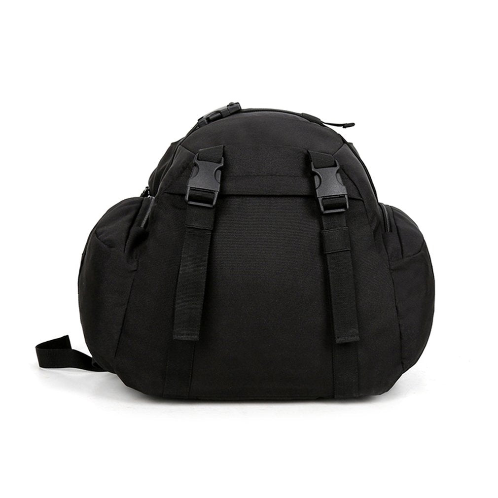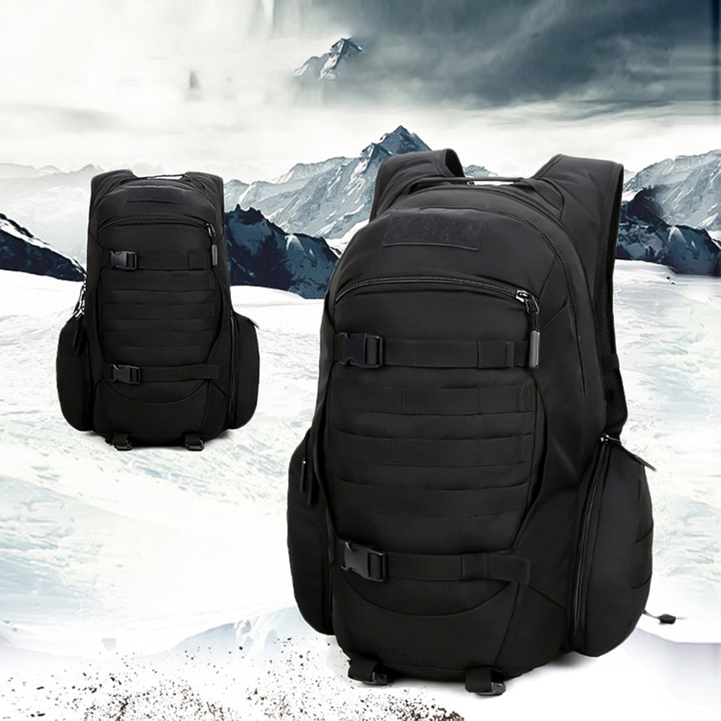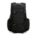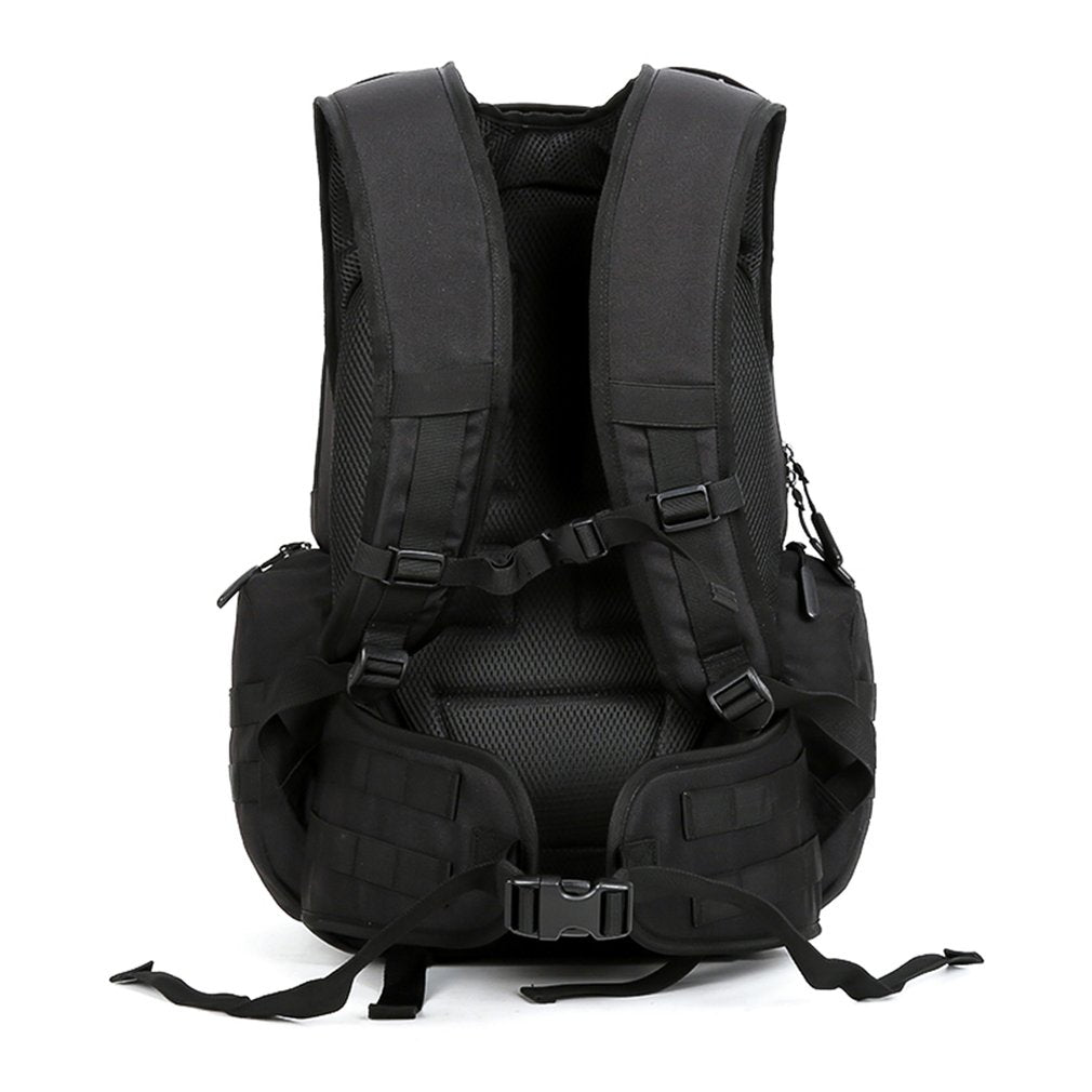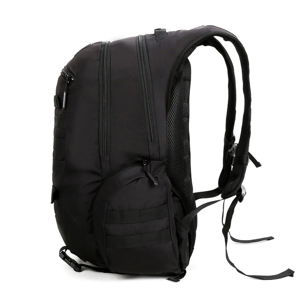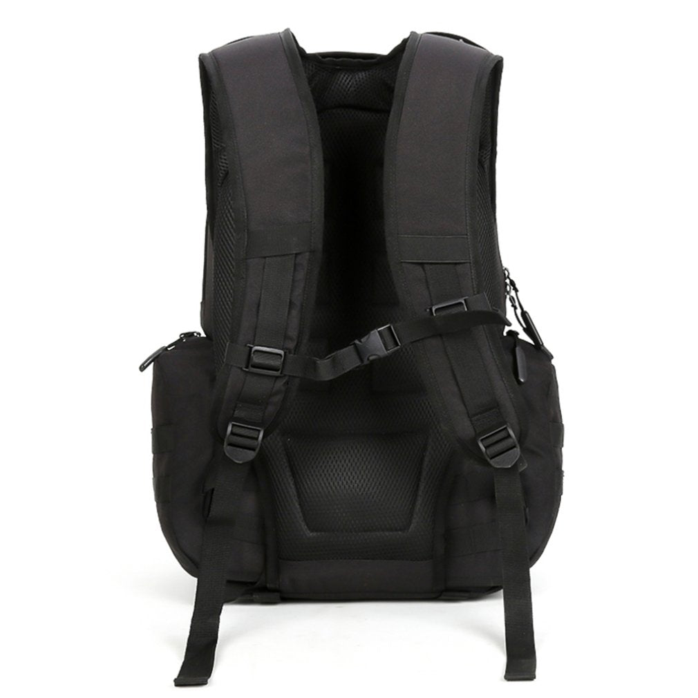 Optimize your travel style in the RPM backpack from eRucks. Featured in a stealthy black, water-resistant material, this backpack is equipped with a large main storage compartment offering two additional internal pockets, a padded laptop sleeve big enough for a 15" laptop, two side water bottle sleeves, removable skateboard straps and dual straps at the bottom so you can carry anything from a blanket to a sleeping bag. The RPM Style Military Molle Backpack is finished with padded shoulder straps and sternum strap for ultimate comfort while carrying your life around.