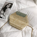 Add some playful textures to your accessories with this gorgeous Women's Hexagon Straw and Vegan Leather Crossbody Bag featuring a wood construction, hexagonal silhouette, vegan leather accents and chain strap.